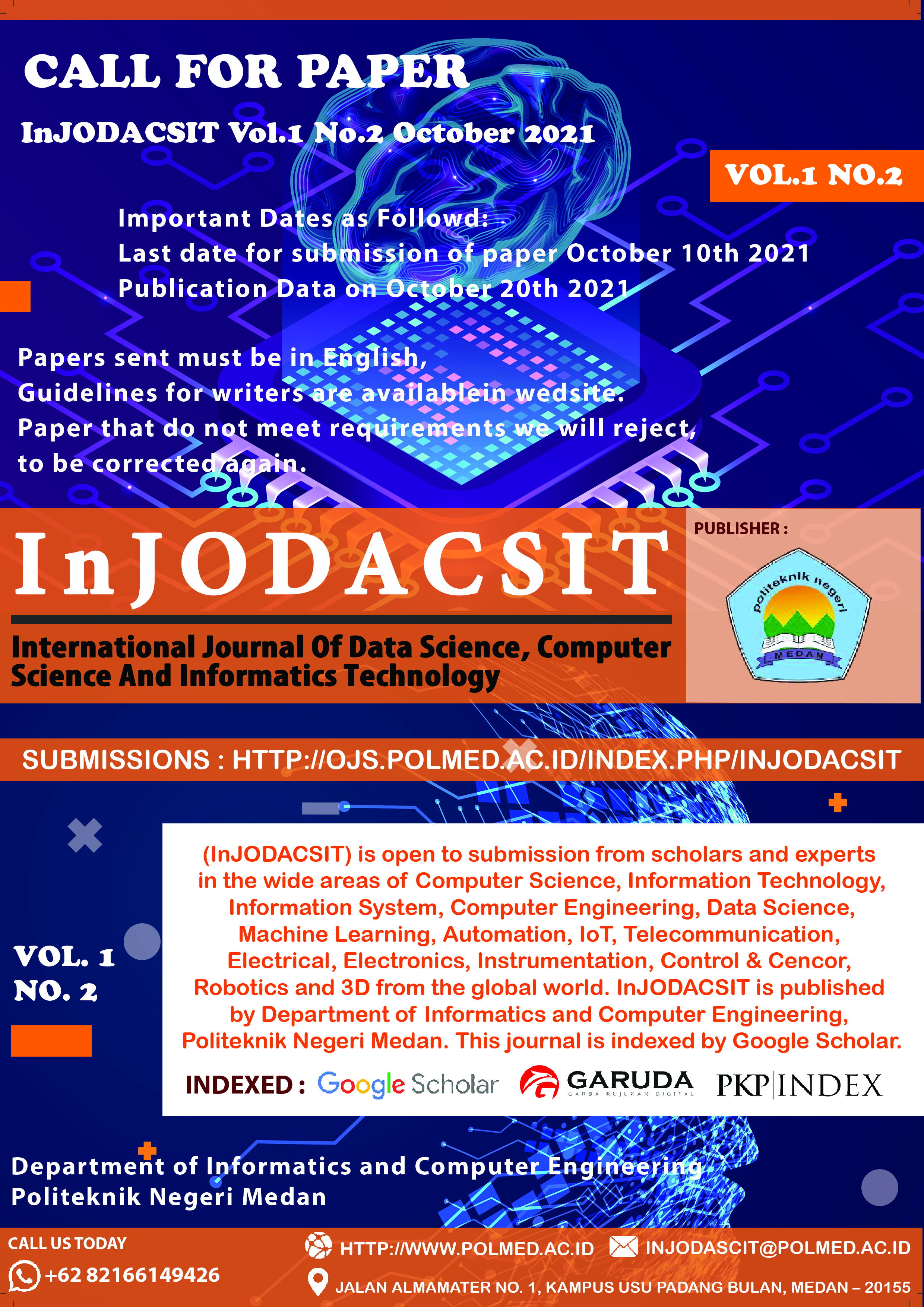 (InJODACSIT) is open to submission from scholars and experts in the wide areas of Computer Science, Information Technology, Information System, Computer Engineering, Data Science, Machine Learning, Automation, IoT, Telecommunication, Electrical, Electronics, Instrumentation, Control & Cencor, Robotics and 3D from the global world. InJODACSIT is published by Department of Informatics and Computer Engineering, Politeknik Negeri Medan. This journal is indexed by Google Scholar.
